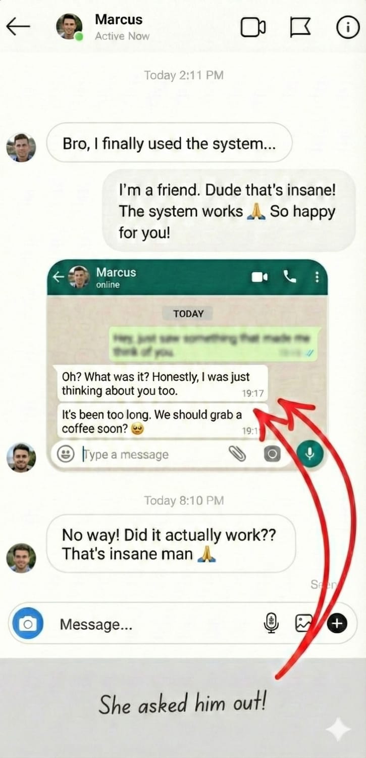 I panicked when I saw her with another guy. Did no contact for a month β wrong move. Found this system, sent one strategic text, she replied in 12 minutes. Two weeks later she ended things with him. We've been back together for 6 months.