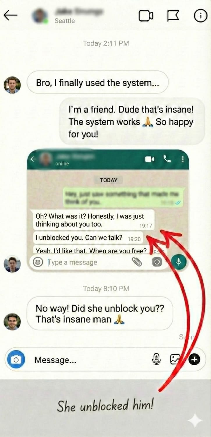 She blocked him everywhere after he made every desperate mistake in the book β 50 texts, showing up at her place, the works. He followed the system, waited 2 weeks, sent ONE text. She unblocked him within hours. They're back together and stronger than ever.